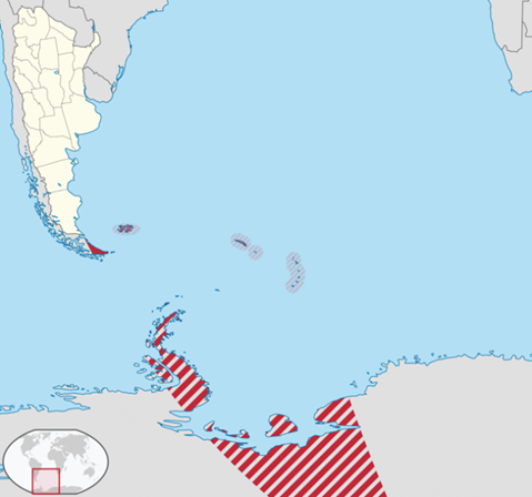 图中红色部分为火地、南极和南大西洋诸岛省的位置,红白相间处系主权争议地区 |
